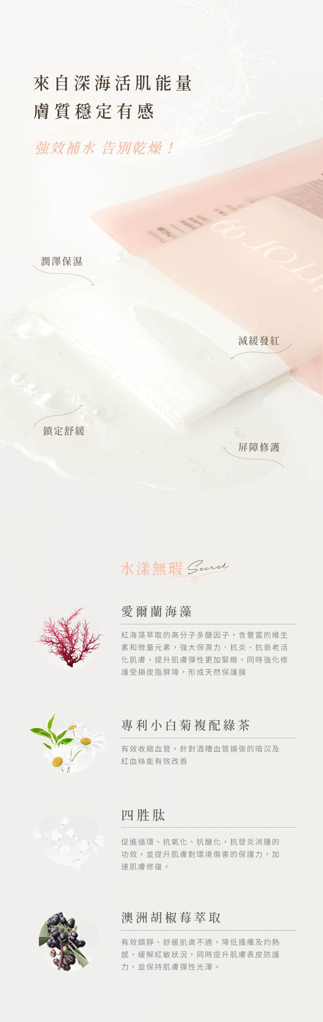 全效保濕修護,對日常保養肌膚提供深層補水、長效保濕、抗敏舒緩不適